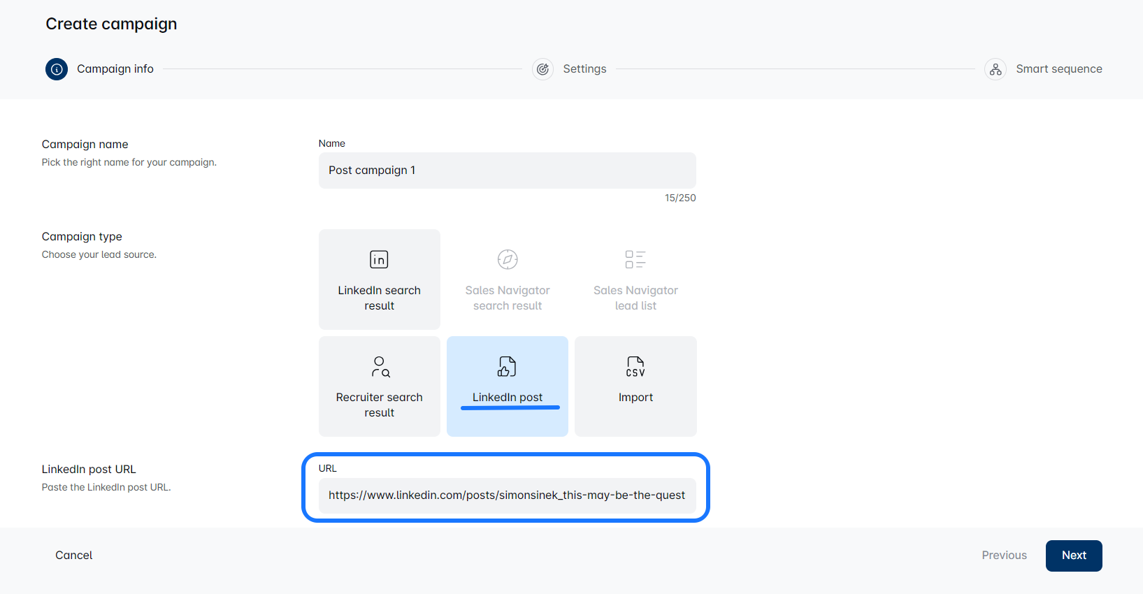Head over to your ZRG LinkedIn Marketing dashboard and paste that link right in. ✂️📋 The system is smart—it’ll automatically figure out that you’re setting up a Post Engagement campaign based on the URL!