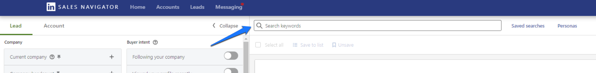 - Click on the "Search" bar at the top of your Sales Navigator dashboard.