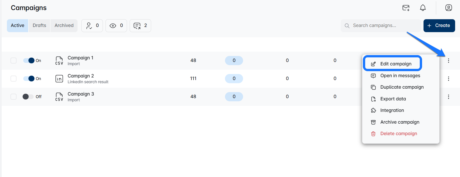 - First, find the campaign you want to edit. Click on the three dots (π΄π΄π΄) on the right side of the page and select 'Edit Campaign'.