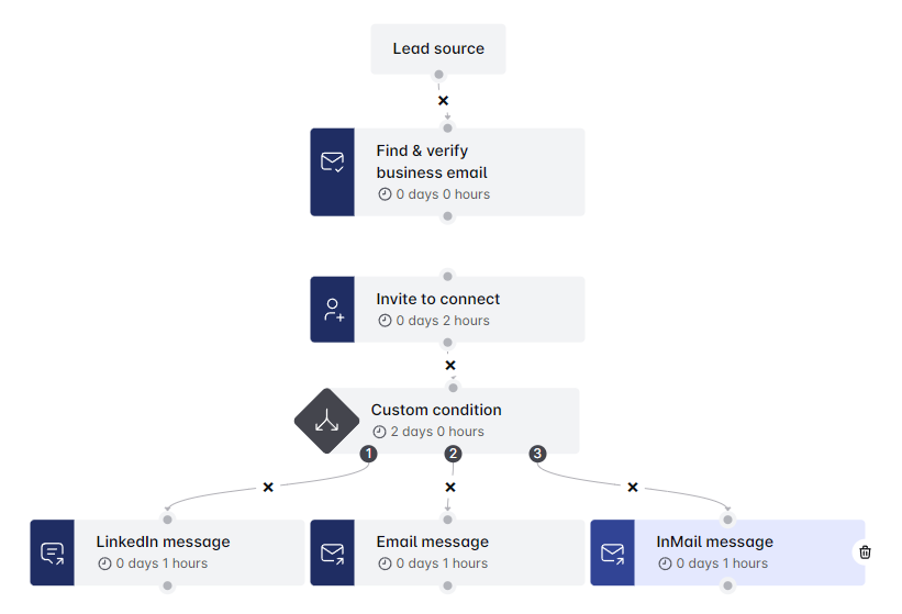 Now, imagine the lead isn’t connected, doesn’t have a verified email, but is open to Free InMails. For this scenario, select "If not connected", "If has NOT verified email", and "If InMail free?". Choose "InMail message" as the action.