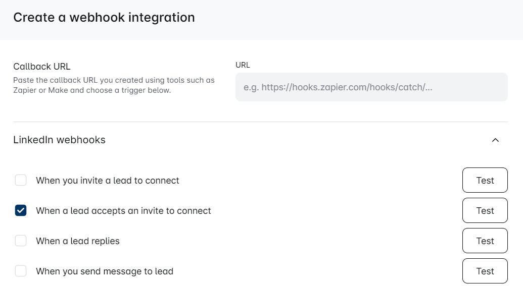 Go to the Webhooks page on your ZRG LinkedIn Marketing dashboard.