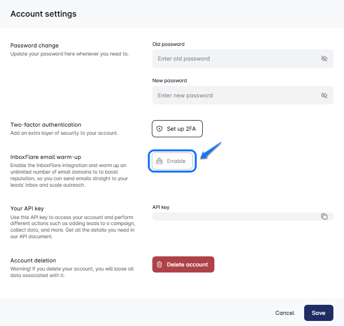 1. To start, you need to enable your InboxFlare account in ZRG LinkedIn Marketing. Go to your Account settings in ZRG LinkedIn Marketing and find the InboxFlare email warm-up. Click “Enable”.