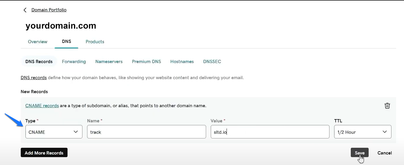 - This time, under record type in the dropdown menu, find CNAME, and paste the details provided in ZRG LinkedIn Marketing’s Custom tracking domain settings.
